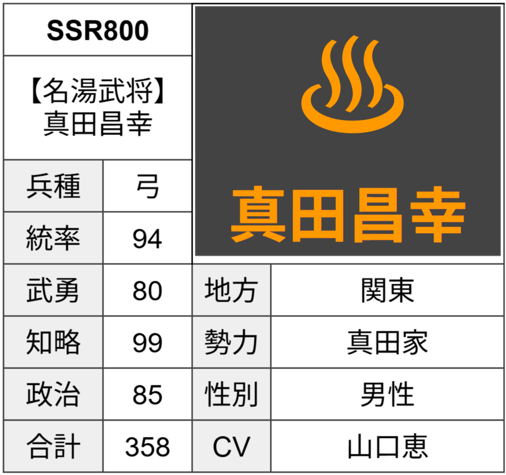 真田家には弓のSSR武将が多いため兵種一致と勢力一致は狙いやすいです。