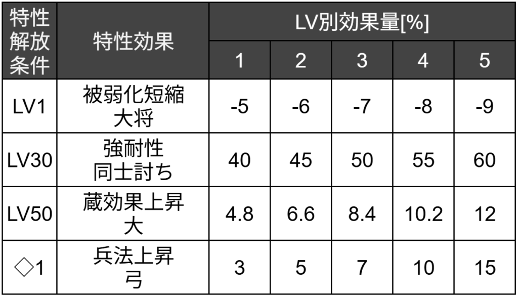 特性を所持する武将を蔵に配置すると蔵の効果が上昇します。