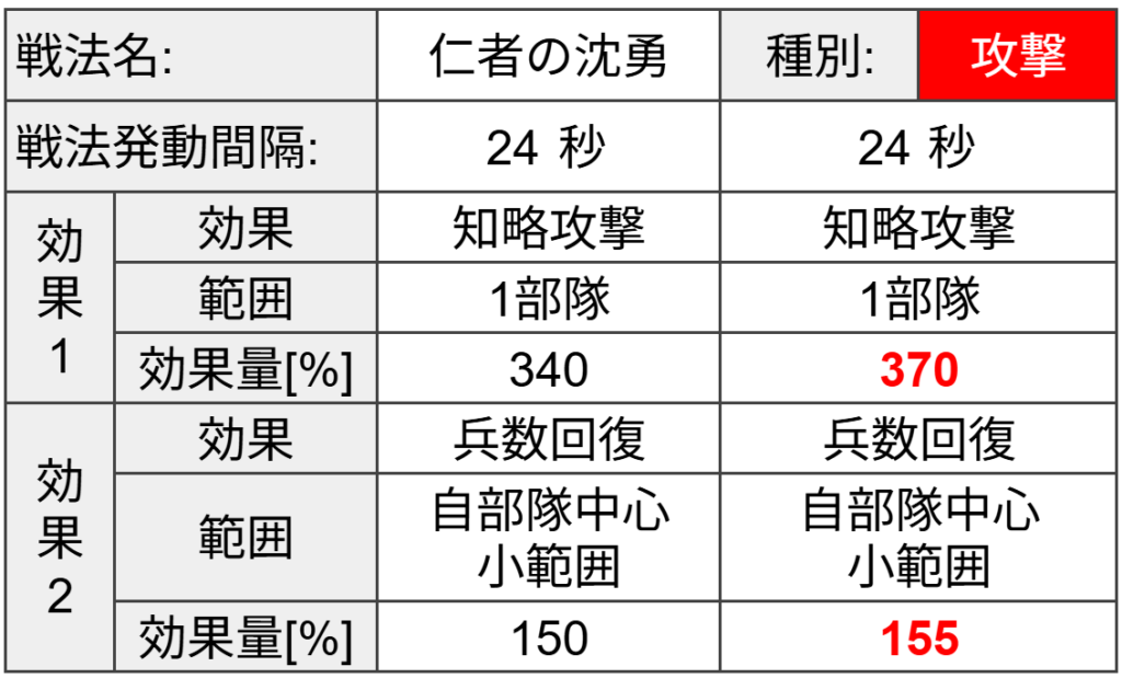 【知略攻撃】も【兵数回復】も自部隊の【兵法】が高いほど効果が高まります。