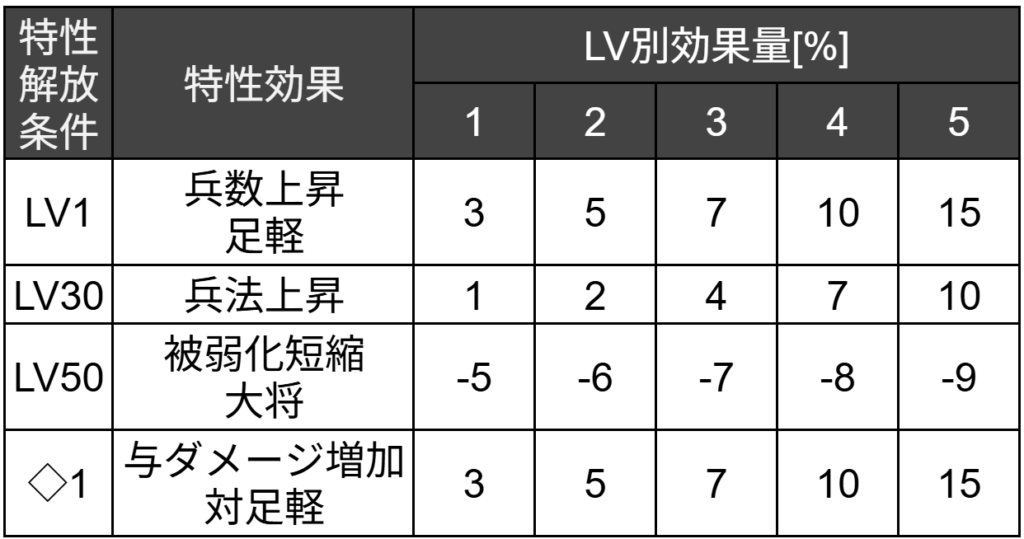 足軽兵種を大将に起用するプレイヤーが多くなるほど【与ダメージ増加・対足軽】の価値は高くなっていきます。