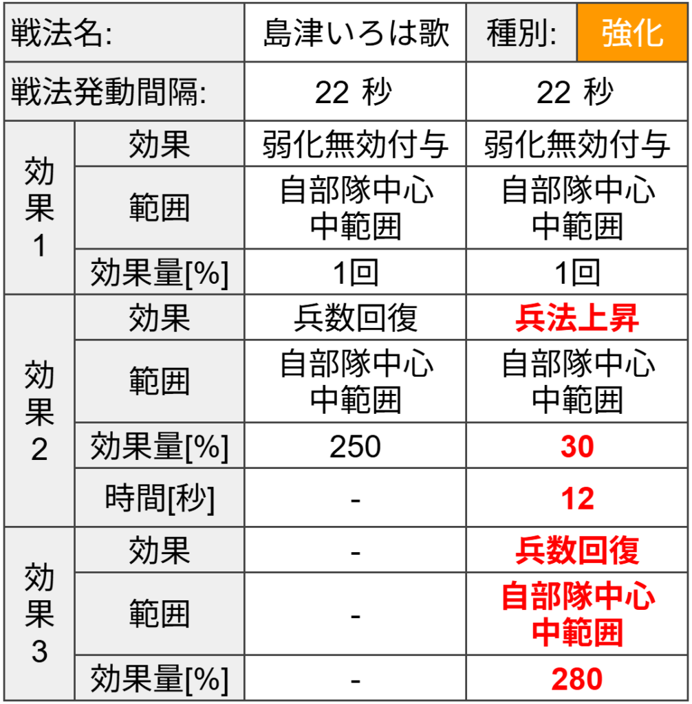 効果は【弱化無効付与】と【兵数回復】の強化系戦法です。