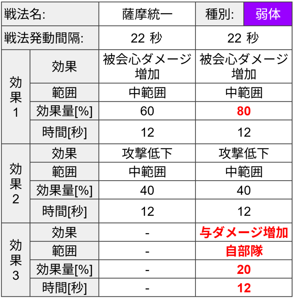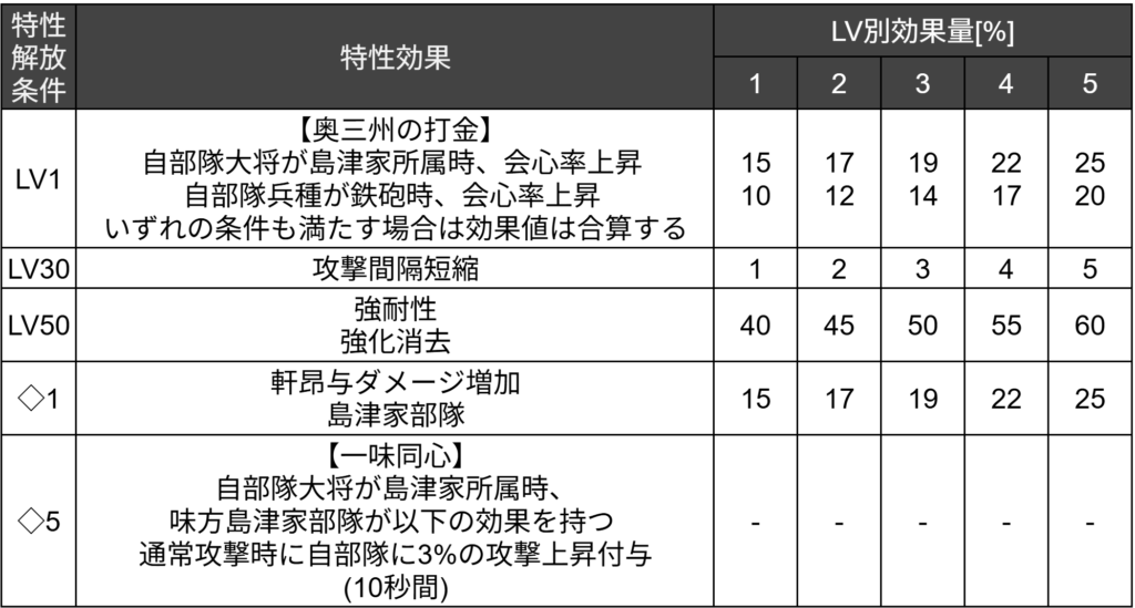 効果は自部隊大将が島津家所属時、味方島津家部隊が通常攻撃時に自部隊攻撃上昇3%付与(10秒間)されます。