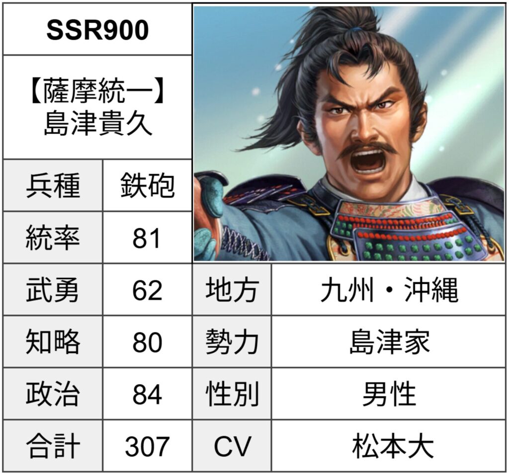 島津家は鉄砲SSR武将が多数存在するため、勢力一致、兵種一致、地方一致の編成ボーナスが狙いやすいです。