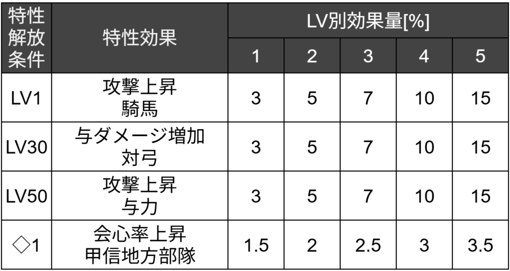 【攻撃上昇・騎馬】は兵種的に相性が良くて扱いやすい特性と言えます。