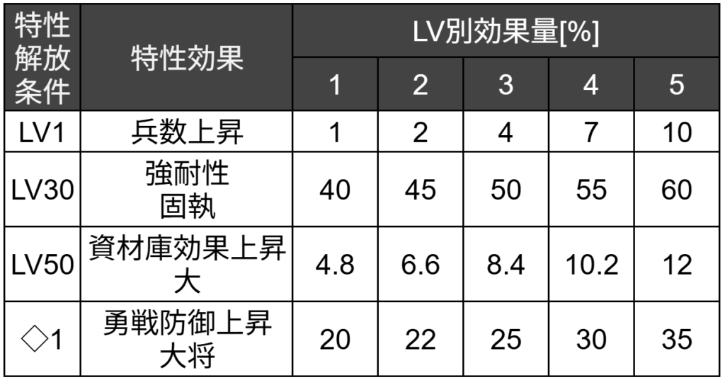 特性を所持する武将を資材庫に配置すると資材庫の効果が上昇します。