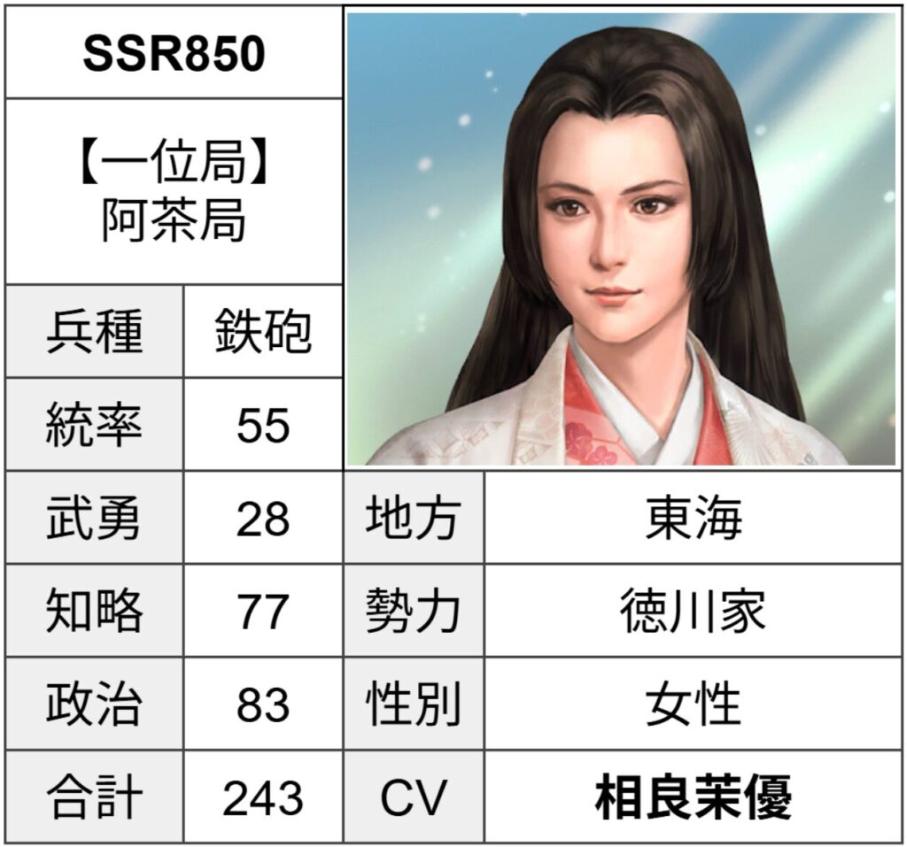 阿茶局はキャンペーン報酬武将のため、再入手の機会が少ないと考えられます。