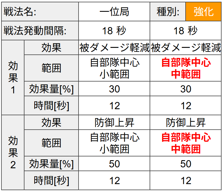 強化することで効果範囲が自部隊中心小範囲から中範囲へと拡大されます。