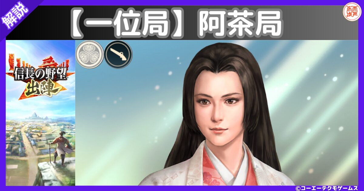 【一位局】阿茶局の戦法や特性・能力・官職(所縁武将)に加えて、運用案についても紹介しております。入手方法も掲載していますので未所持の方も参考にしていただけると幸いです。