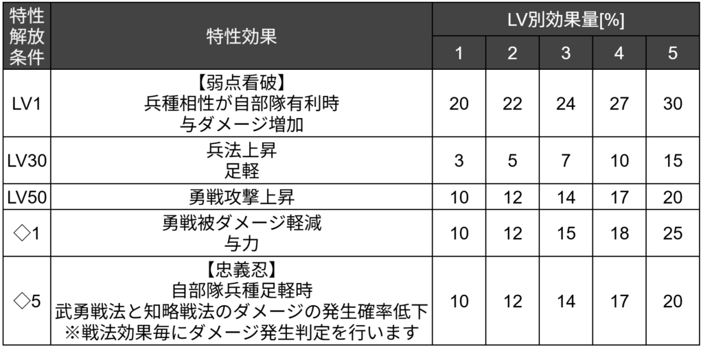 効果は『兵種相性が自部隊有利時、与ダメージ増加』です。