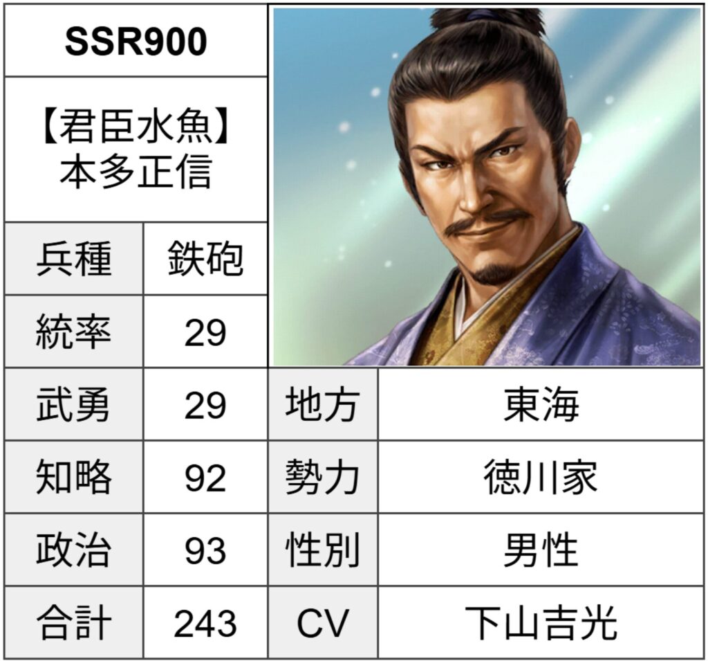 総合能力値243というのは以心崇伝と同じです。両者とも徳川家の頭脳として活躍した武将です。以心崇伝は大坂の陣で登場するかと思いましたが、登場しませんでした。いつかSSR版が出て欲しいですね。