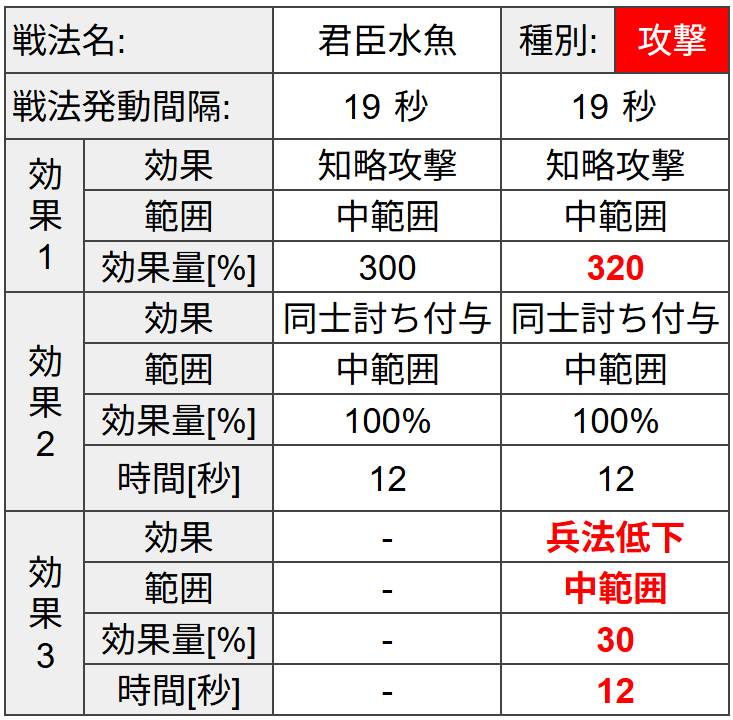 通常攻撃で弱化効果を付与できる武将が増えてきました。相手の兵法を下げこちらの兵法を上げる事で『相手からの弱化効果は短く』『こちらが付与する弱化効果は長く』することが出来ます。派手さはありませんがとても便利な特性です。