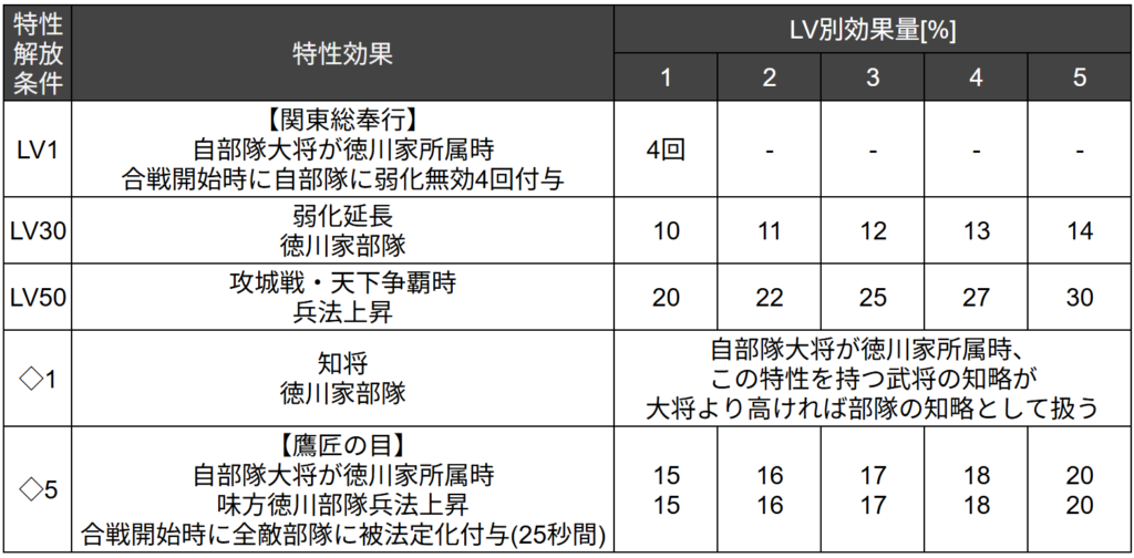 効果は自部隊の大将が徳川家所属時、味方徳川家部隊の兵法上昇と、合戦開始時に全敵部隊へ兵法低下を25秒間付与するというものです。
