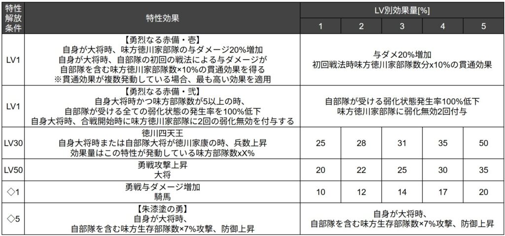 効果は自身が大将時、味方徳川家部隊の与ダメージ20%増加と、自部隊の初回の戦法による与ダメージが自部隊を含む味方徳川家部隊数×10%の貫通効果を得るです。