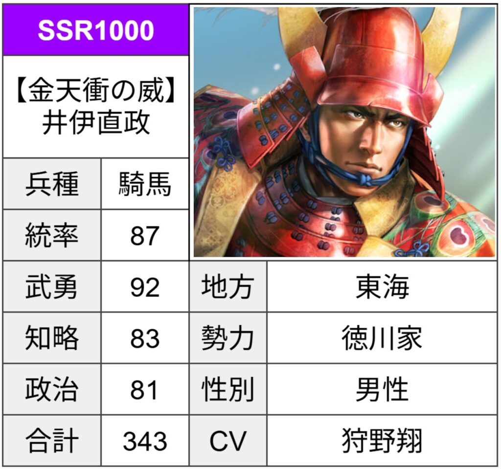 総合能力値は343と徳川家の中でもSSR武将全体の中でも高い部類です。