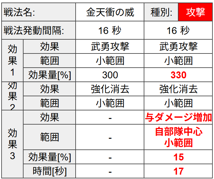 効果は自身が大将時、自部隊を含む味方生存部隊数×7%の攻撃、防御上昇です。