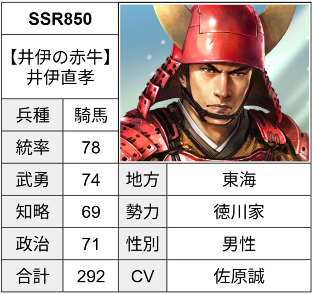 【井伊の赤牛】井伊直孝の戦法や特性・能力・官職(所縁武将)に加えて、運用案についても紹介しております。入手方法も掲載していますので未所持の方も参考にしていただけると幸いです。