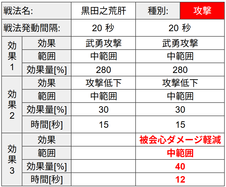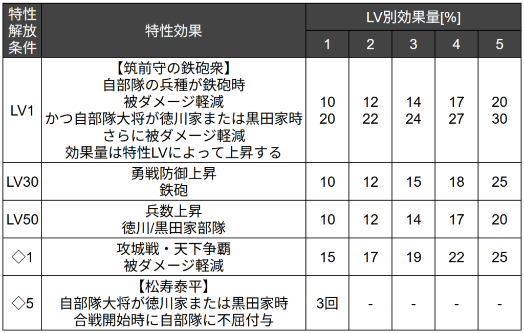さらに、自部隊大将が徳川家または黒田家時、被ダメージ軽減が追加されます。