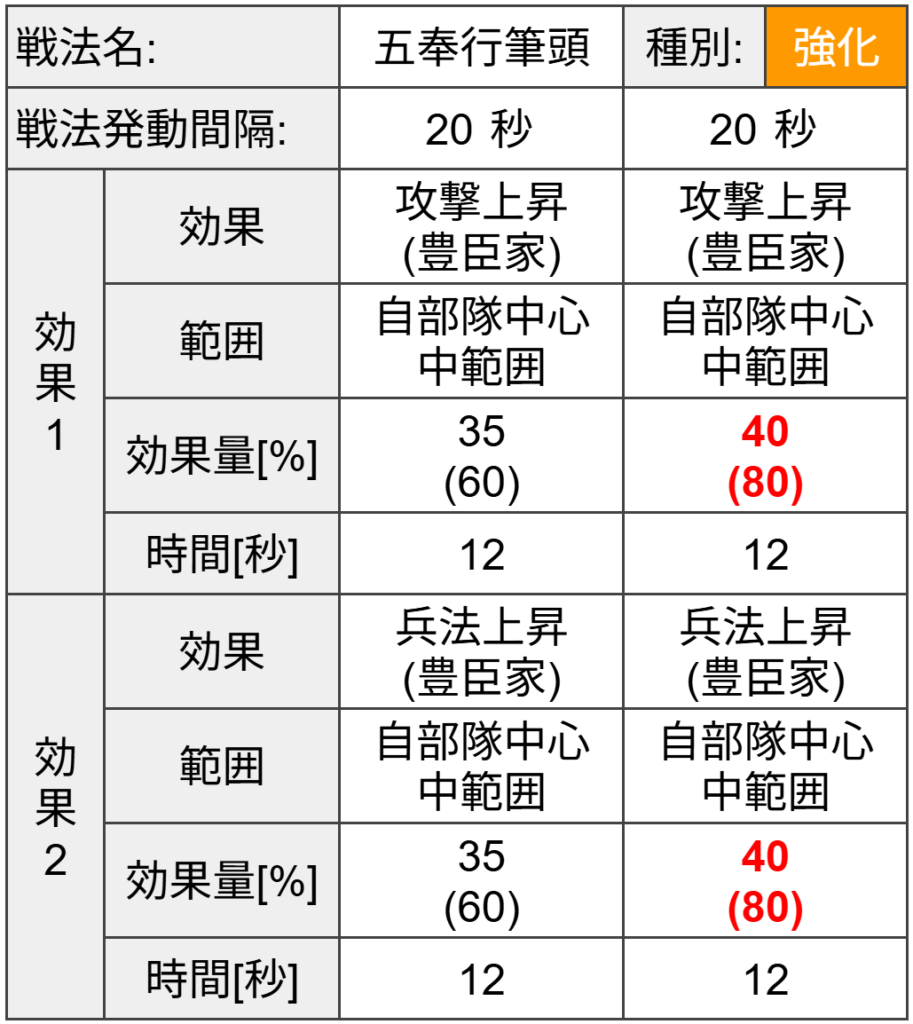 【攻撃上昇(豊臣家)】と【兵法上昇(豊臣家)】の効果を持つ強化系戦法。