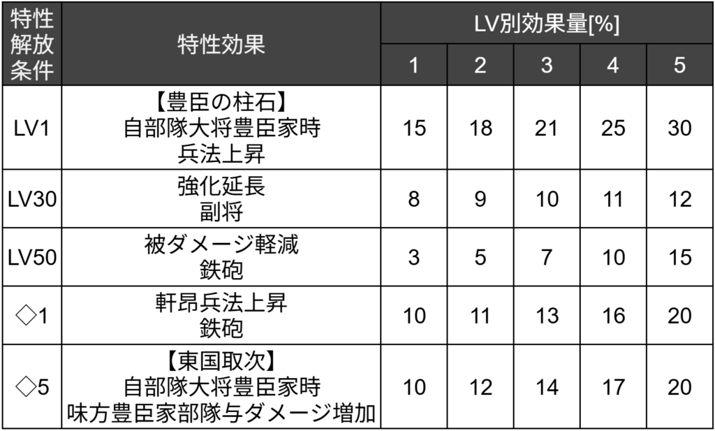 効果は自部隊大将豊臣家時、味方豊臣家部隊与ダメージ増加です。
