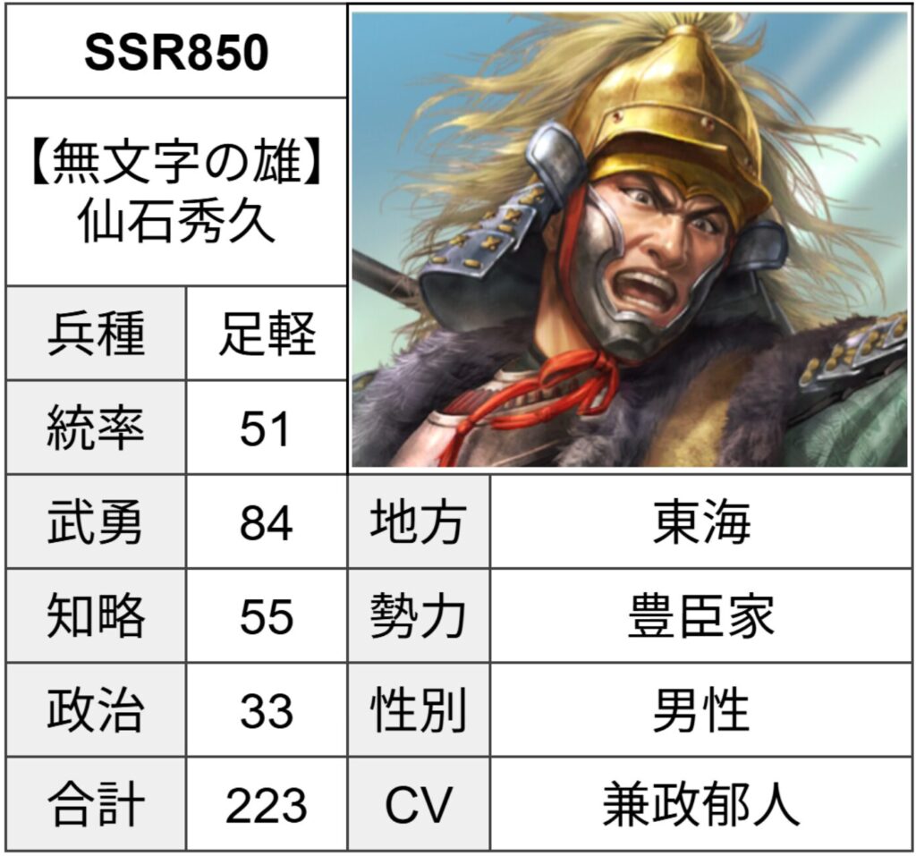 豊臣家は近畿と東海で武将を2分しているため、東海地区の豊臣家で武将を固めようとした場合、意外と使う機会が巡ってくる武将です。
