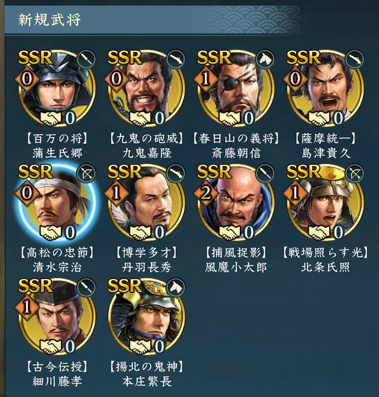 【捕風捉影】風魔小太郎のみ◇2で、あとは◇1~◇0でした。【揚北の鬼神】本庄繁長に関しては未獲得でした。どの武将も魅力的ですので、誰から育てようか悩むところですね。