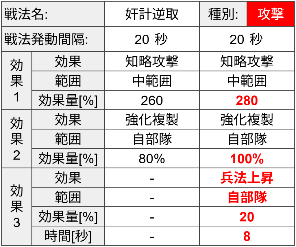 効果は【知略攻撃】と【強化複製】の攻撃系戦法。