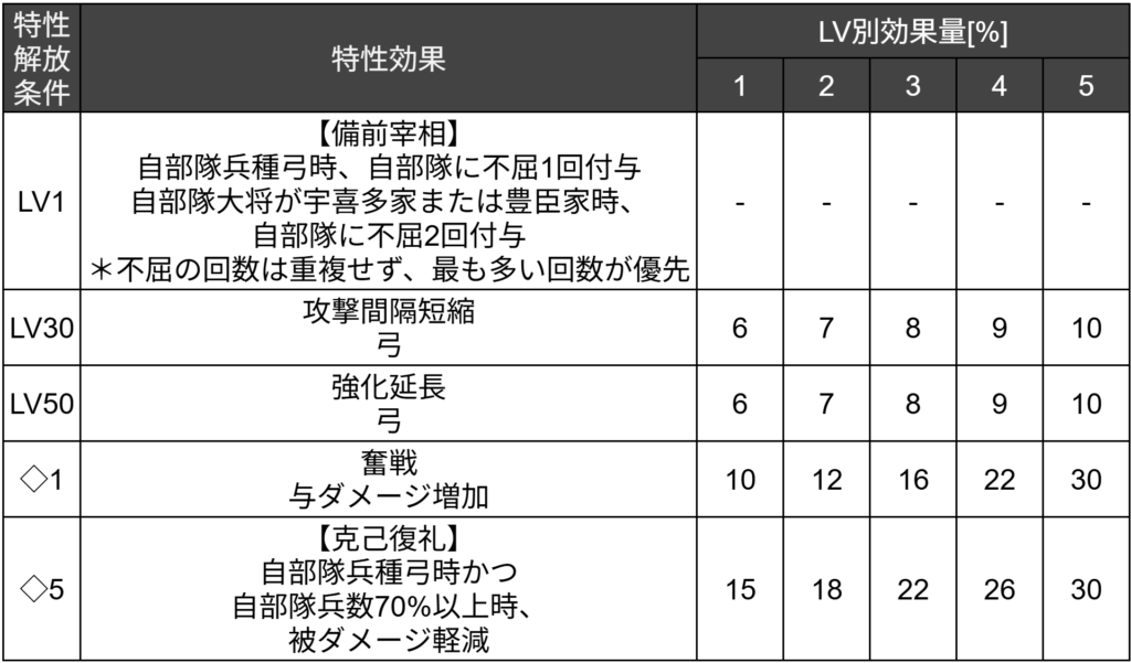効果は自部隊の兵種が弓時、合戦開始時に自部隊に【不屈】を1回付与