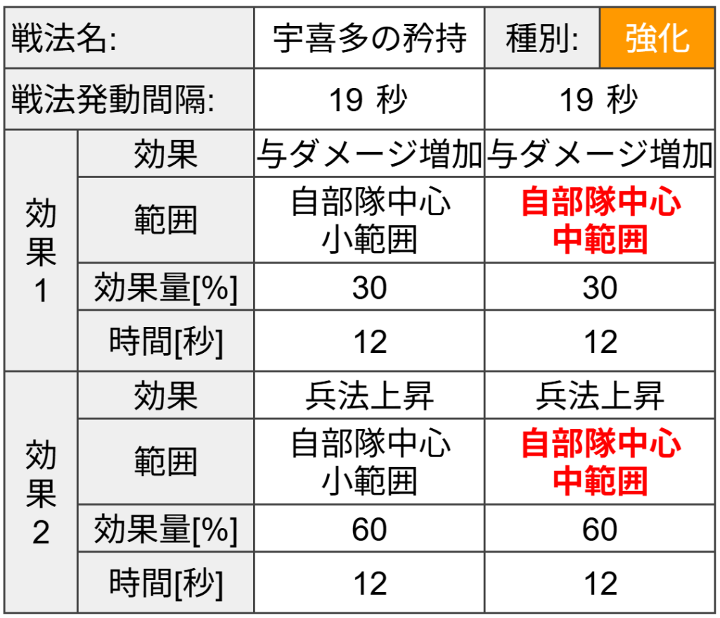 単純にダメージを増加させる効果の他に、敵部隊に弱体効果を付与したり自部隊に強化状態を付与する特性も登場しました。