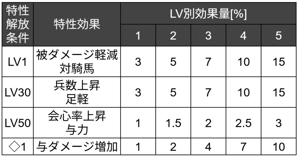 【被ダメージ軽減・対騎馬】はそうしたリスクを低減してくれる特性です。