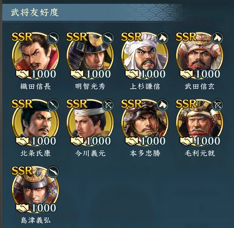 これら9人は最初期から登場しているSSR900武将達となります。