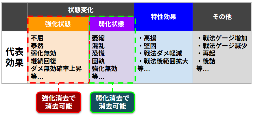 強化無効や戦法威力減算は状態変化欄に記載されている。だから弱化消去で消せる。といった感じに判断してください。
