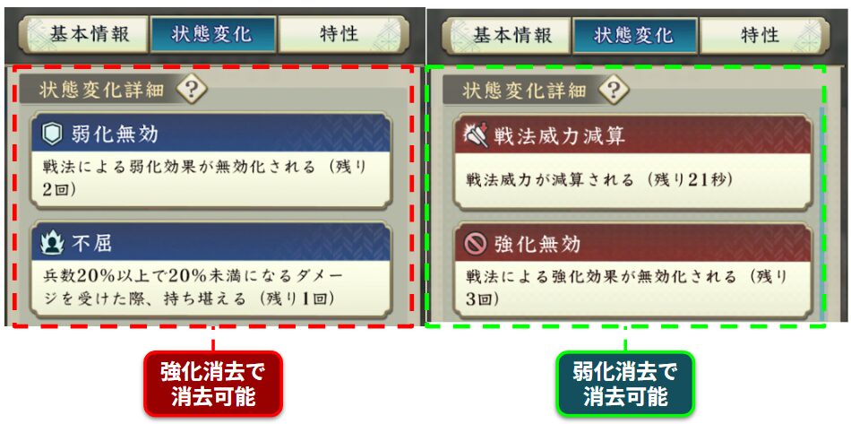 戦法ダメージ軽減や再起や後詰といった、消去できない類の効果は状態変化欄には表示されません。