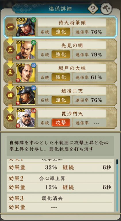 上の例だと弱化消去を行う【侍大将筆頭】甘粕景持を与力2に配置しています。これにより他3人の配下武将は弱化消去後に戦法を発動できます。