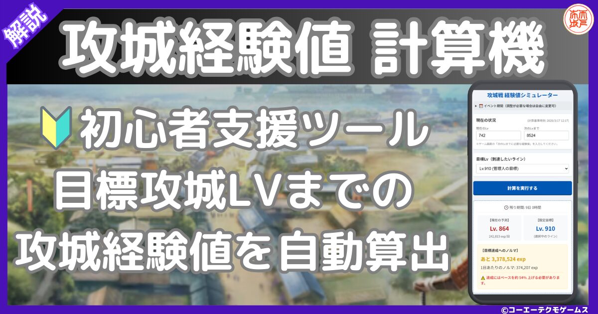 あとどのくらいで目標の攻城Lvに到達できるのかの計算機も記載しています。攻略の参考にしていただけると幸いです。