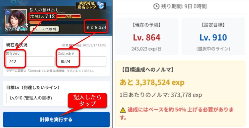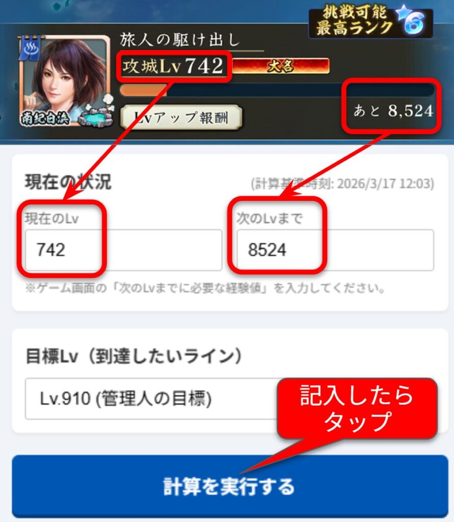 ゲーム画面を見ながら現在の攻城LVと次のLvまでに必要な経験値を入力してください。