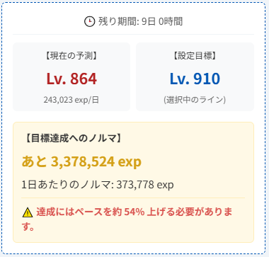 また設定した目標に対して、あとどのくらいの経験値が必要なのかと、1日平均のノルマが表示されます。