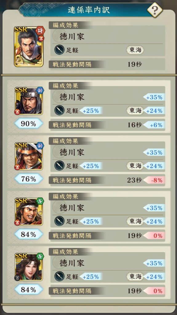 【徳川家】【東海地方】【足軽兵種】で固めているため、各種編成ボーナスが発動します。