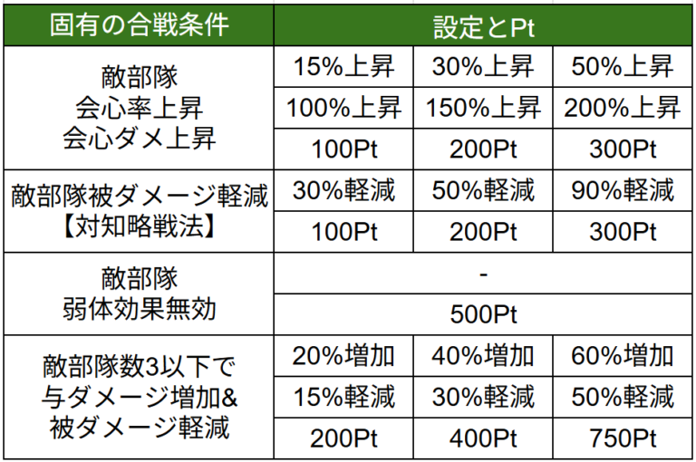編成条件を満たせたら、次は【合戦条件】を設定して敵軍を強くしましょう。