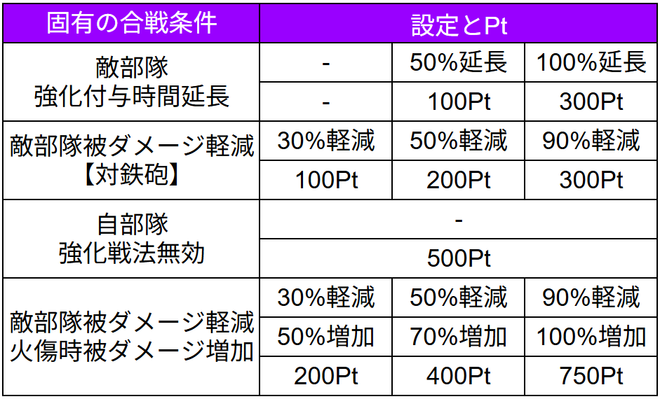 編成条件を満たせたら、次は【合戦条件】を設定して敵軍を強くしましょう。