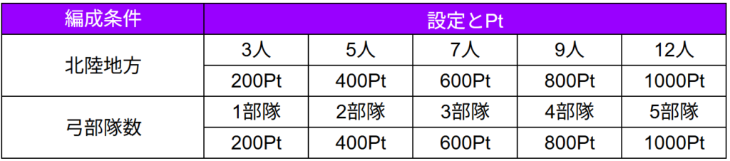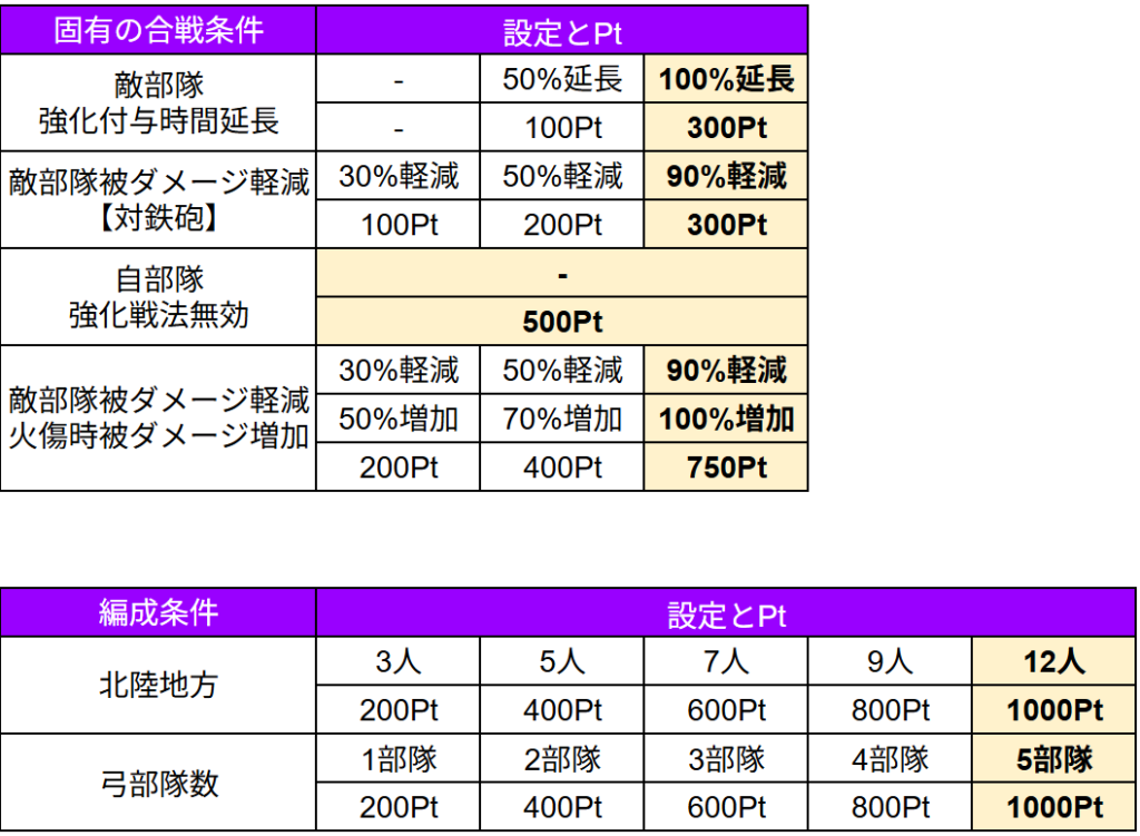 『用兵指南』は【合戦条件】と【編成条件】で『紋印』の獲得数が増減します。