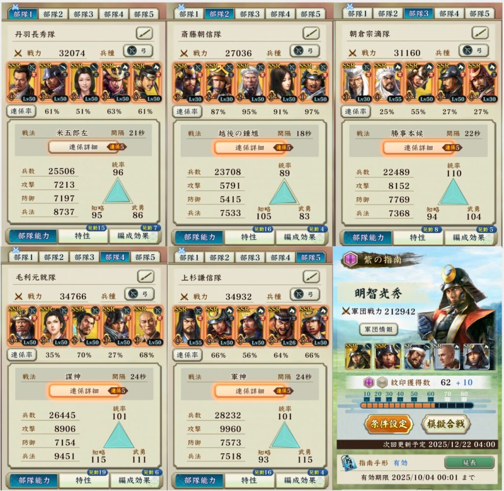 『用兵指南』が期間限定のイベント(敵襲イベント)だった頃から、私が好んで用いている編成があります。こちらの編成を用いることで、武将の覚醒段階が低い状態でも合戦条件を厳しくして勝利することが可能になります。