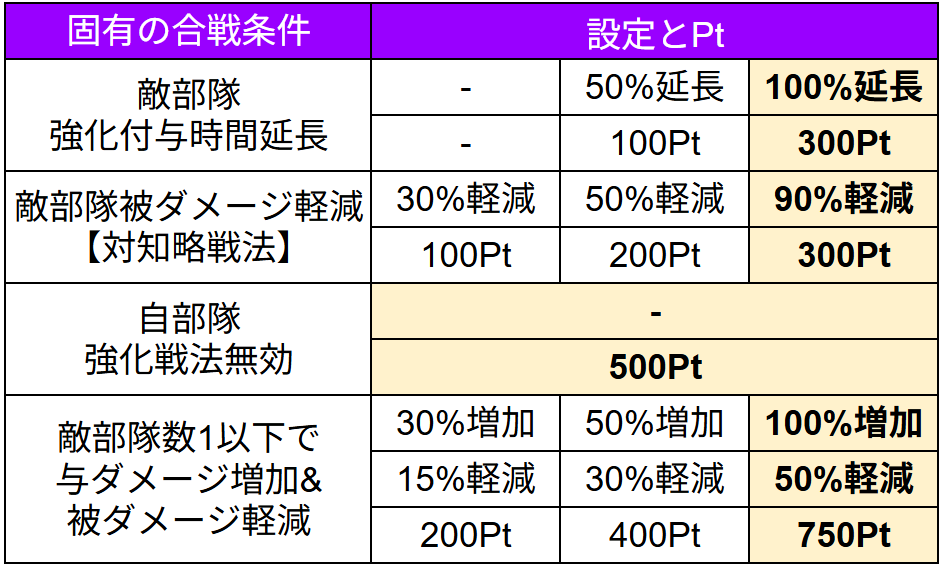 『用兵指南』は【合戦条件】と【編成条件】で『紋印』の獲得数が増減します。