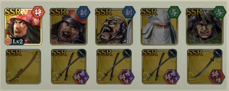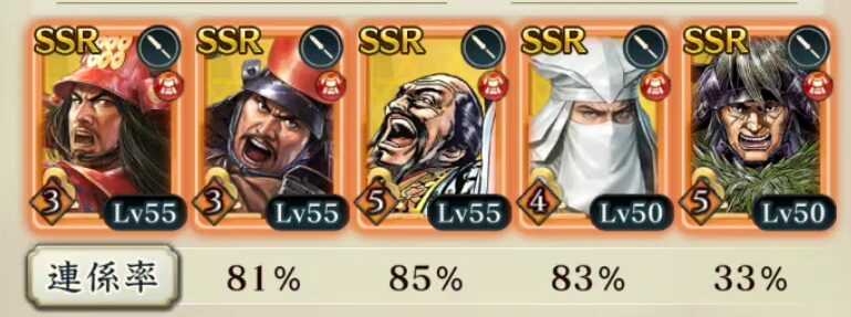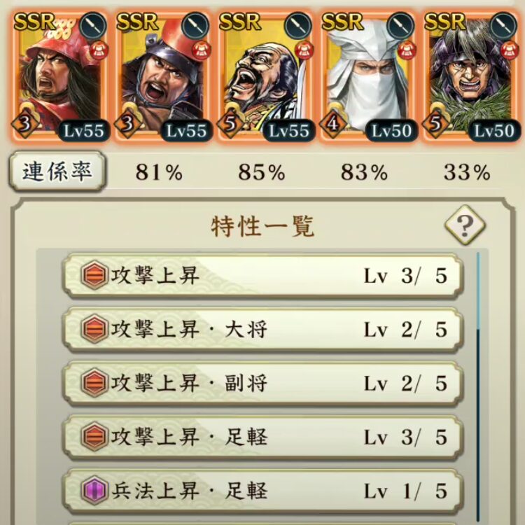 『用兵指南』が期間限定のイベント(敵襲イベント)だった頃から、私が好んで用いている編成があります。こちらの編成を用いることで、武将の覚醒段階が低い状態でも合戦条件を厳しくして勝利することが可能になります。