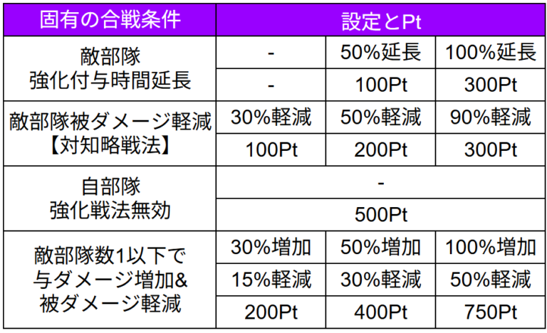 編成条件を満たせたら、次は【合戦条件】を設定して敵軍を強くしましょう。
