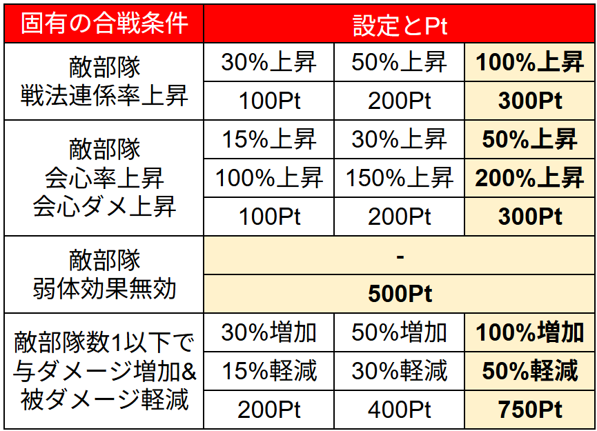 編成条件を満たせたら、次は【合戦条件】を設定して敵軍を強くしましょう。