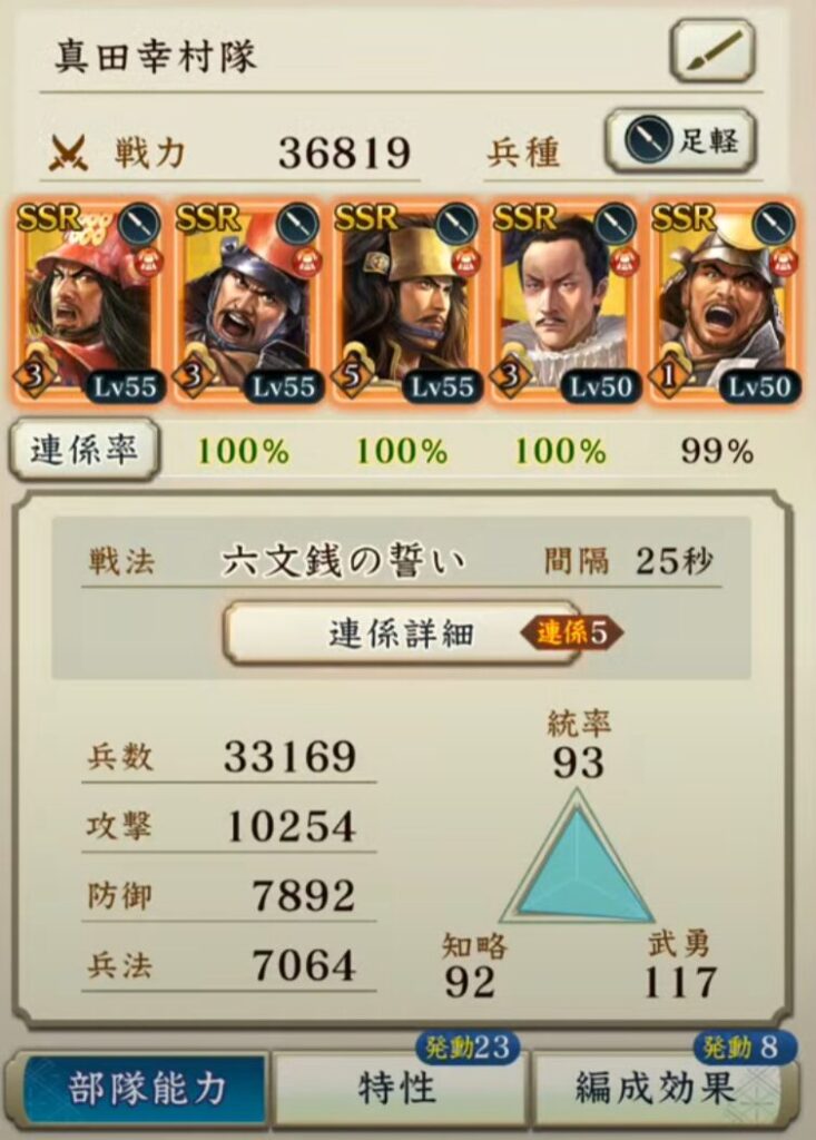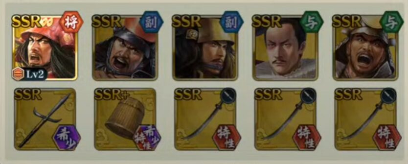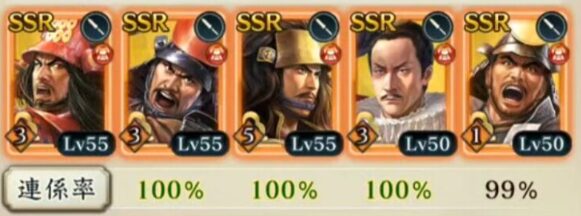 『用兵指南』が期間限定のイベント(敵襲イベント)だった頃から、私が好んで用いている編成があります。こちらの編成を用いることで、武将の覚醒段階が低い状態でも合戦条件を厳しくして勝利することが可能になります。